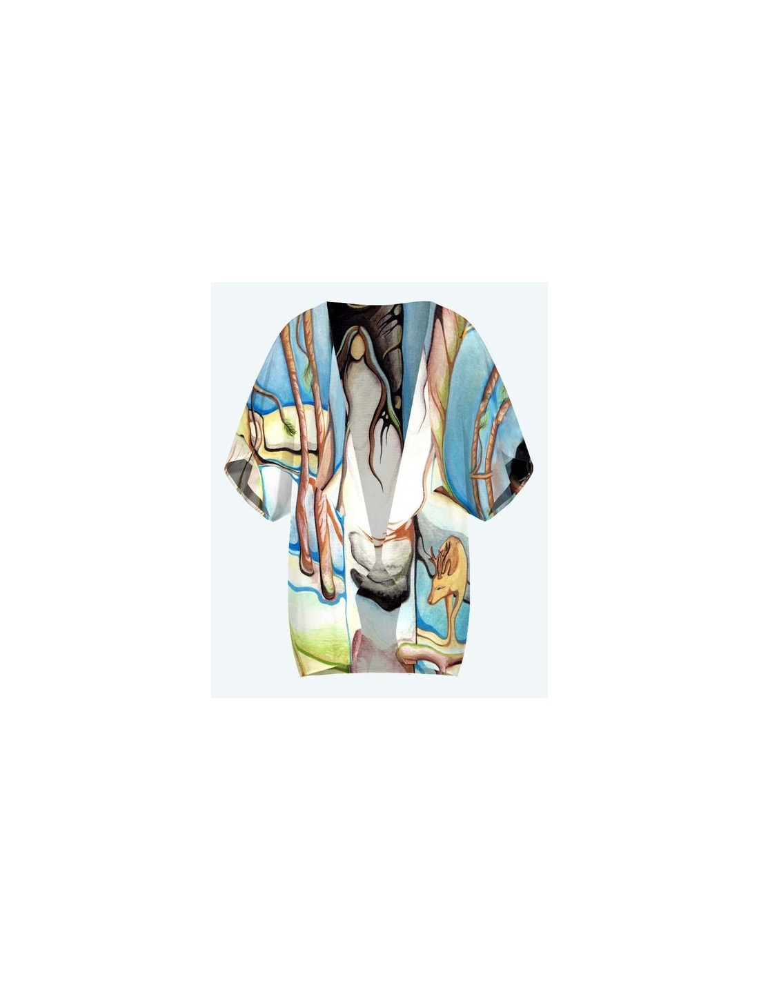 "Passage" by artist Nathalie Coutou. Length: 29”, width: 24" flat with a loose fit. Front arrives mid-thigh, sleeves arrive at the elbows. Made of a woven chiffon (100% Polyester). Machine washable in cold water on delicate cycle, hang dry. One size.