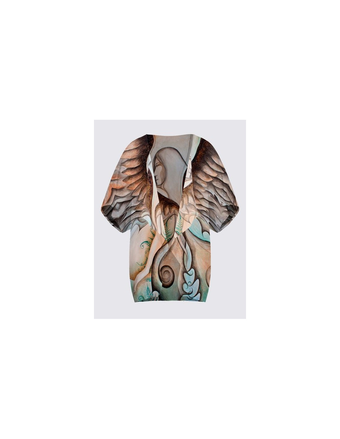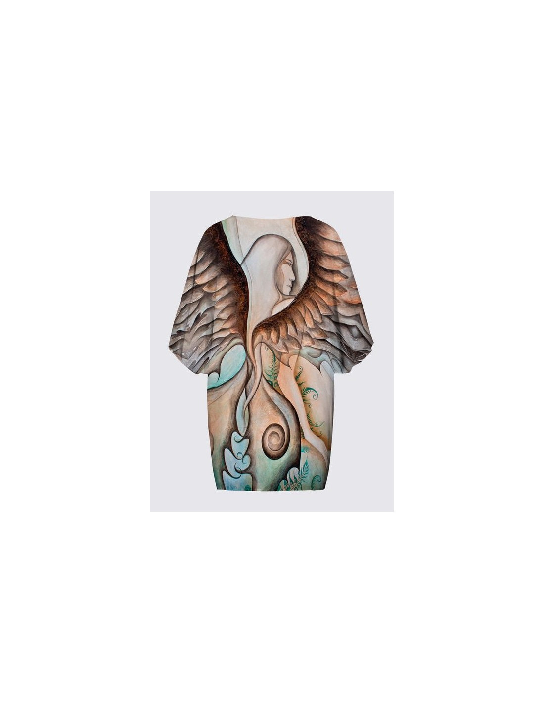 "Gezaluwejit" by artist Nathalie Coutou. Length: 29”, width: 24" flat with a loose fit. Front arrives mid-thigh, sleeves arrive at the elbows. Made of a woven chiffon (100% Polyester). Machine washable in cold water on delicate cycle, hang dry. One size.