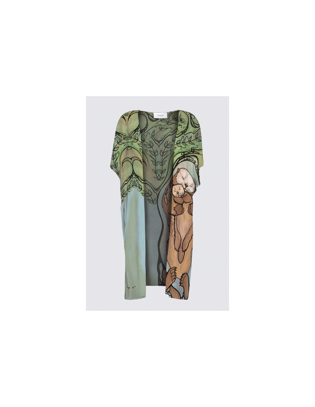 Kimono "M'Otter Love" by artist Nathalie Coutou. Front and back in print Knit Chiffon. Length: 40”. Slit on the sides. Chiffon (100% Polyester). Machine Washable in cold water on delicate cycle, hang dry.