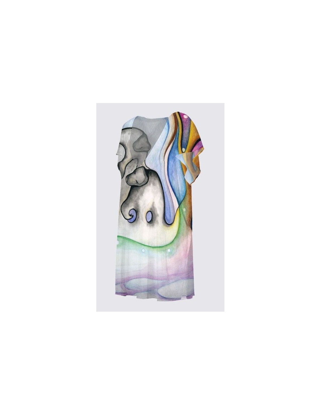 "Inner Memories" by artist Nathalie Coutou. Dress made of knit chiffon (100% polyester) with merrow edge finish. The dress reaches above the knees with 4" slits on the sides reaching mid-thigh with a deep 10" V-neck that can be worn front (arrives at solar plexus) or back. Length is 33” and width is 24" flat.