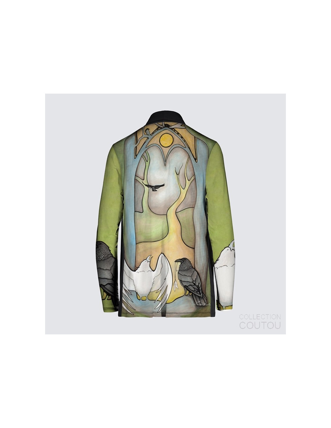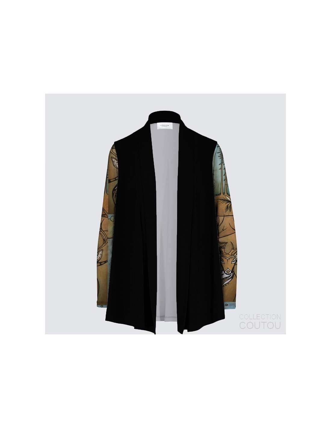 "Temple de la forêt" par l'artiste Nathalie Coutou. Cardigan Frida (95% polyester et 5% élasthanne) avec collet et devant noir. Endos et manches imprimés. Conçu pour une impression par sublimation en haute résolution. Longueur 26.5". Lavez à la machine au cycle délicat à l'eau froide. Séchez à plat.