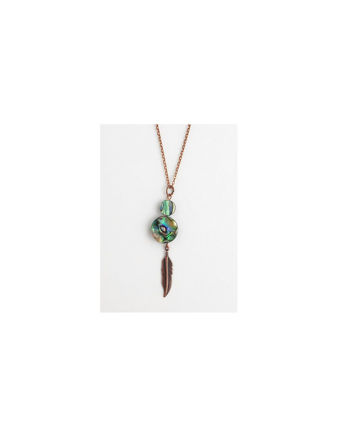 Collection Coquillage Pendentif - Nacre MN105 8,95 $ Pendentif en nacre, œil de Shiva avec plume de cuivre. Fait au Canada. Ajouter au panier