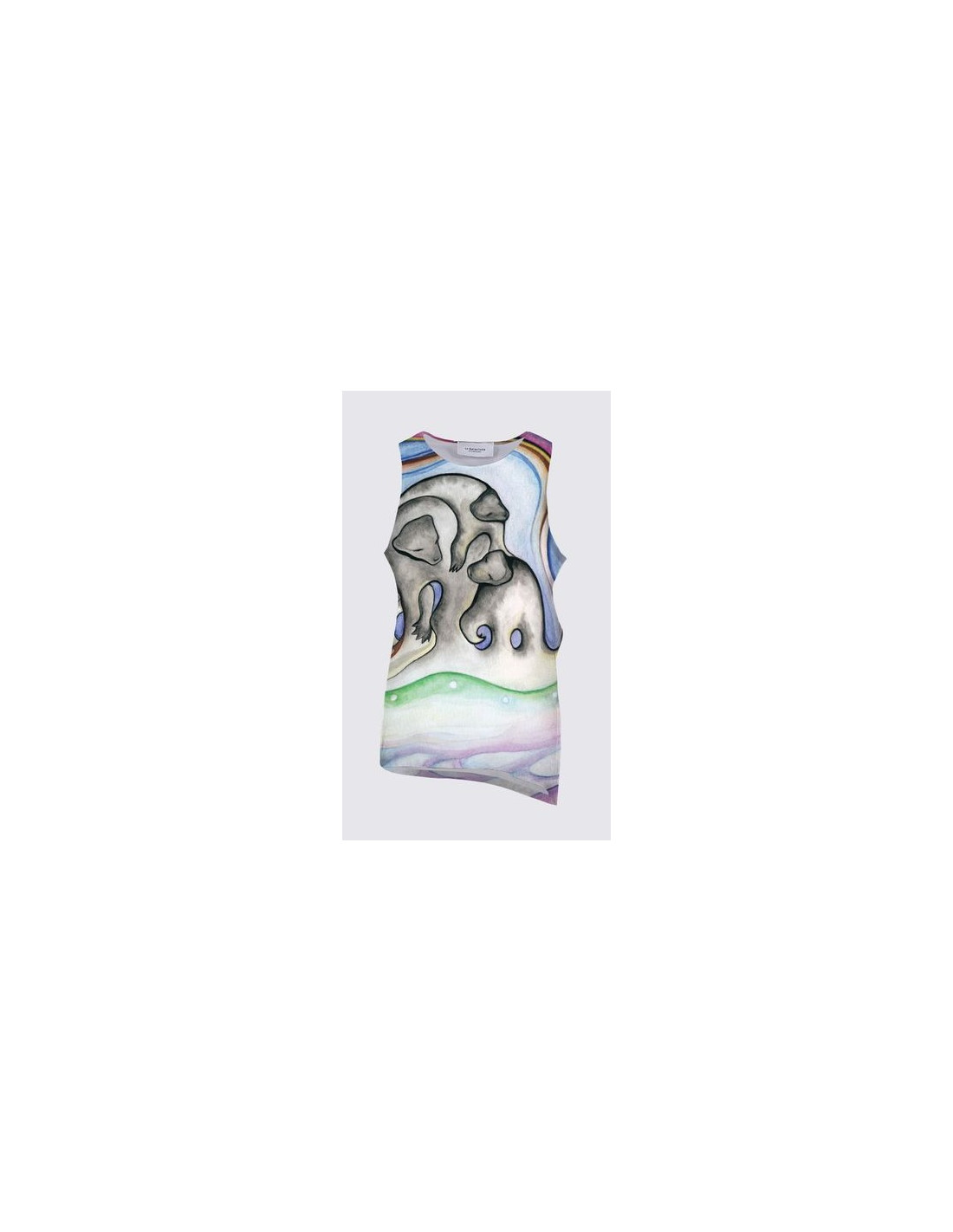 "Mémoires Ancestrales" par l'artiste Nathalie Coutou. Tissu jersey technique ultra doux (95 % polyester, 5 % élasthanne). Ourlet asymétrique avec fente sur le côté. Coupe décontractée d'une courte longueur de 24.5" et d'une longueur pointe de 28".