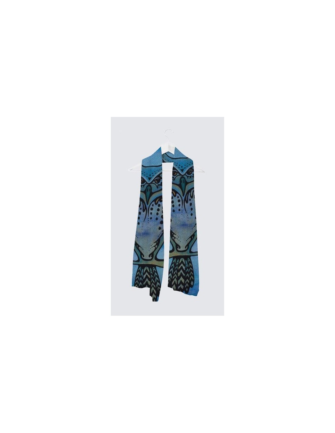 "Gardiens de la Sagesse" par l'artiste Nathalie Coutou. Magnifique foulard conçu dans un doux tricot à base de gris chiné (100% polyester) avec une finition bord merrow. Il mesure 17" x 65". Lavable à la machine à l'eau froide. Suspendre pour sécher. Ne froisse pas. Fait au Québec, Canada.