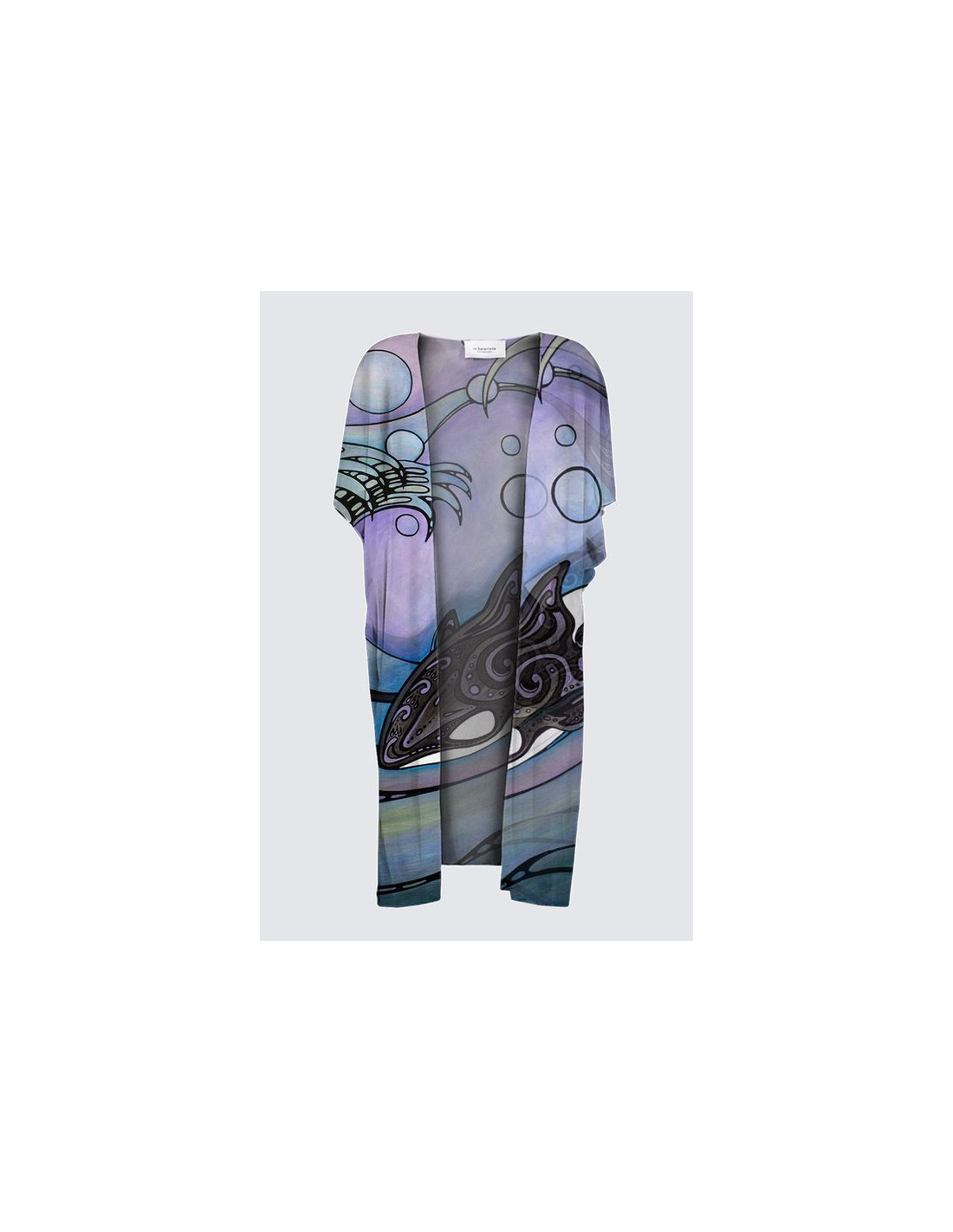 Kimono "Profondeur" par l'artiste Nathalie Coutou. Devant et dos en tricot de chiffon imprimé. Longueur: 40". Fentes sur les côtés. Chiffon (100% Polyester). Lavable à la machine à l'eau froide au cycle délicat, sécher à plat.