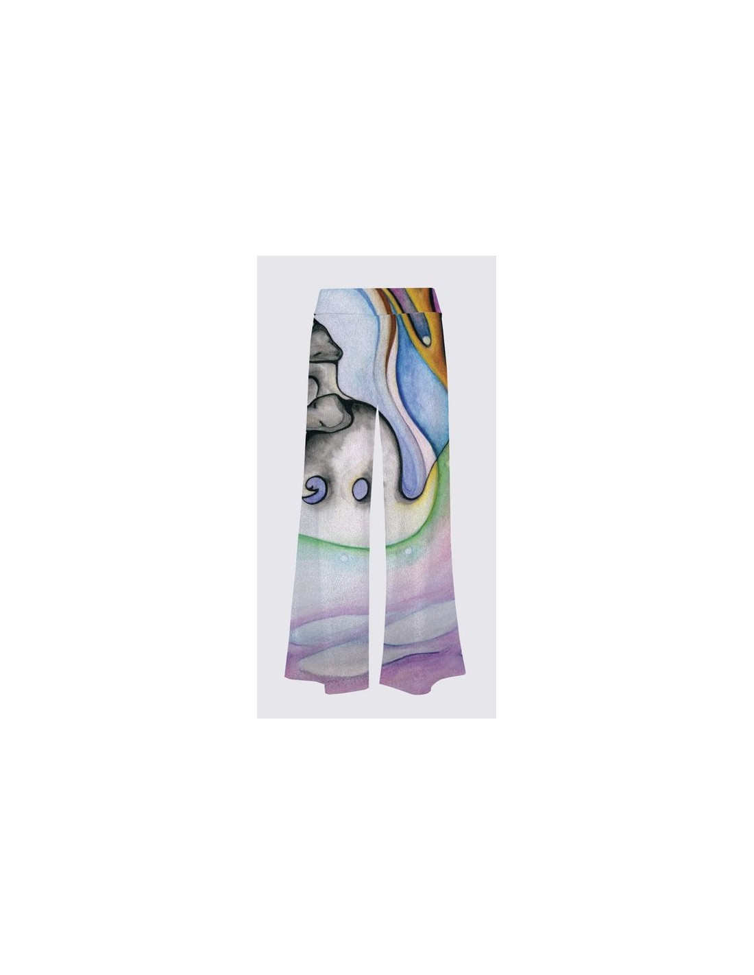 "Mémoires Ancestrales" par l'artiste Nathalie Coutou. Tissu tricot super doux avec base gris chiné (95% Polyester, 5% Élasthanne). Taille haute avec bande de taille élastique, jambe à coupe évasée avec entrejambe de 29".