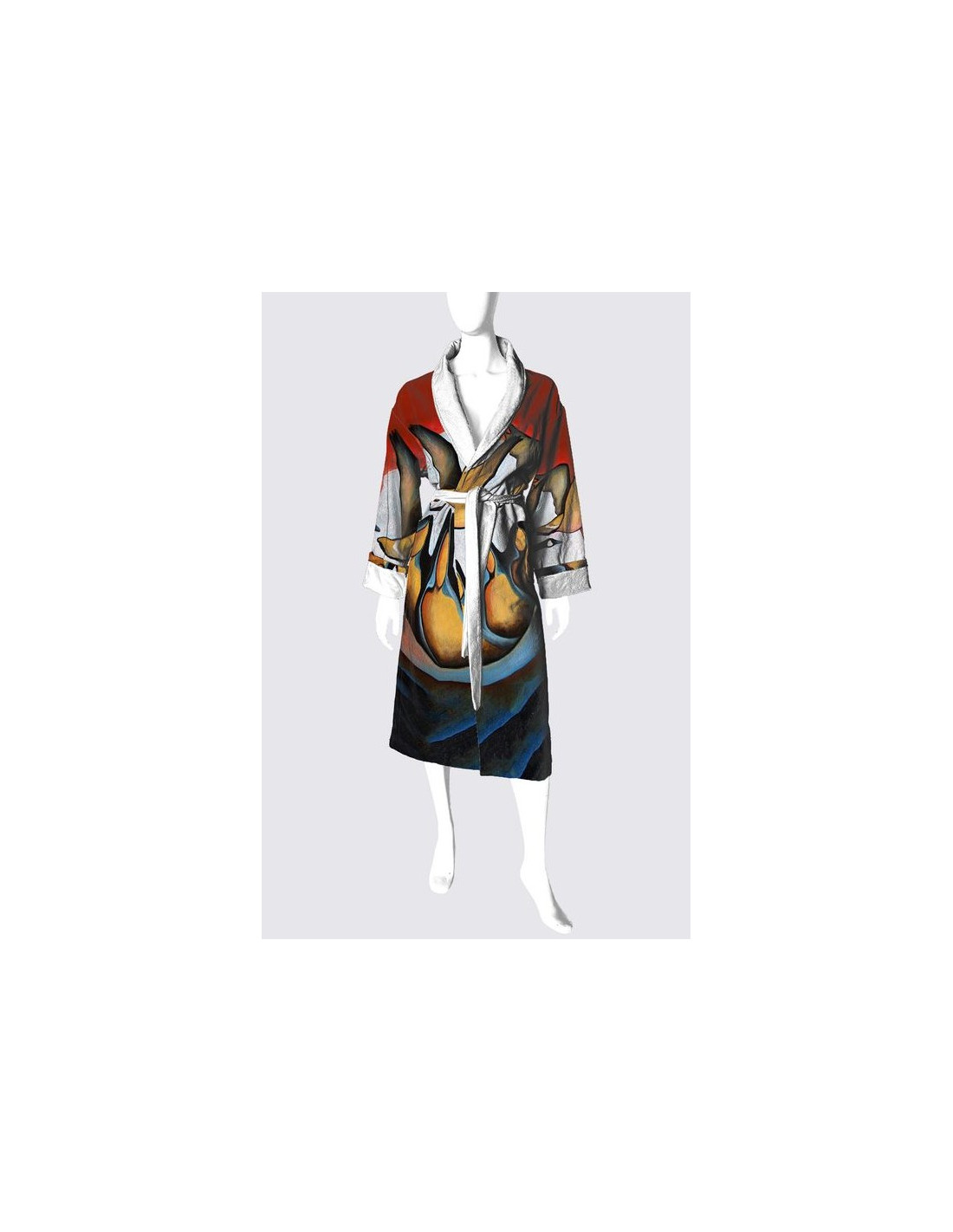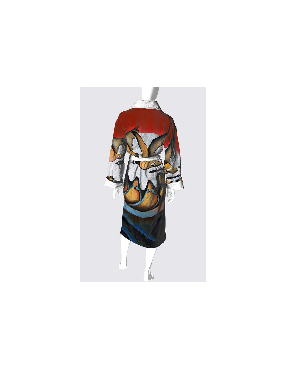 Cette robe est un incontournable pour ceux qui apprécient la qualité et l’art. Elle est fabriquée d’un tissu en microfibre (95% polyester, 5% spandex) avec un intérieur blanc et un col blanc. Elle est d'une longueur de 48" avec des manches mesurant 31" ou 25" lorsqu’elles sont retournées. Elle a deux poches spacieuses (6" x 6") et un devant ouvert avec une ceinture de (70".) La largeur du dos est de 24,5". Une taille unique qui conviendra à une femme jusqu’à la taille extra-large et un homme jusqu’à la taille large. Lavable à la machine au cycle délicat dans l’eau froide, séchez à plat.