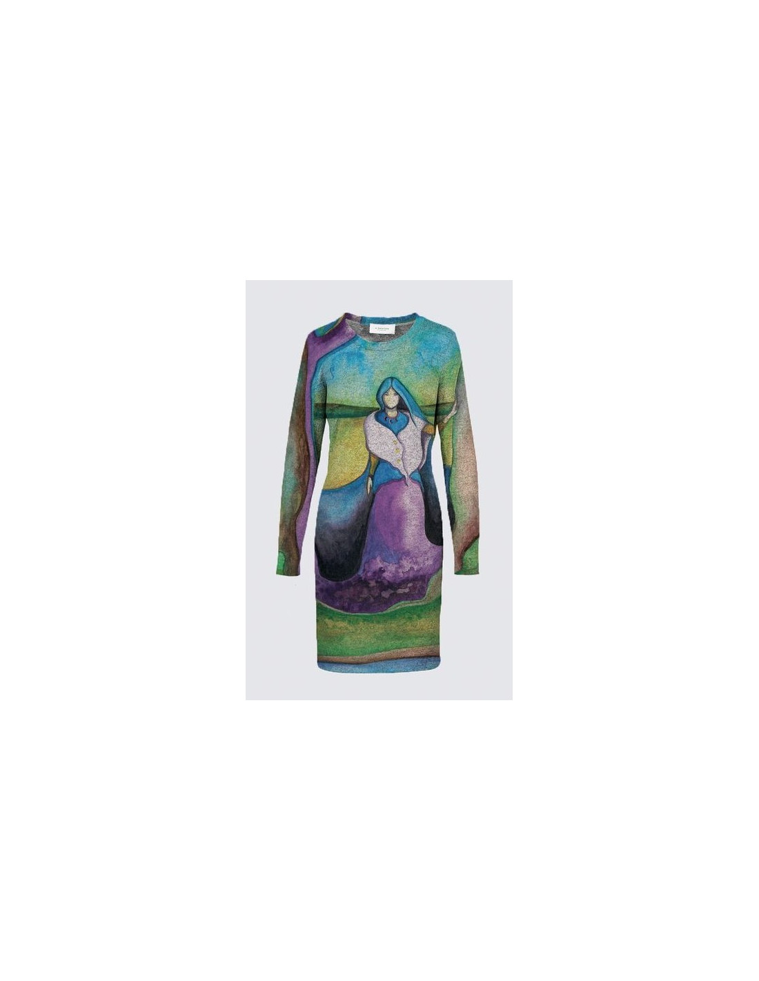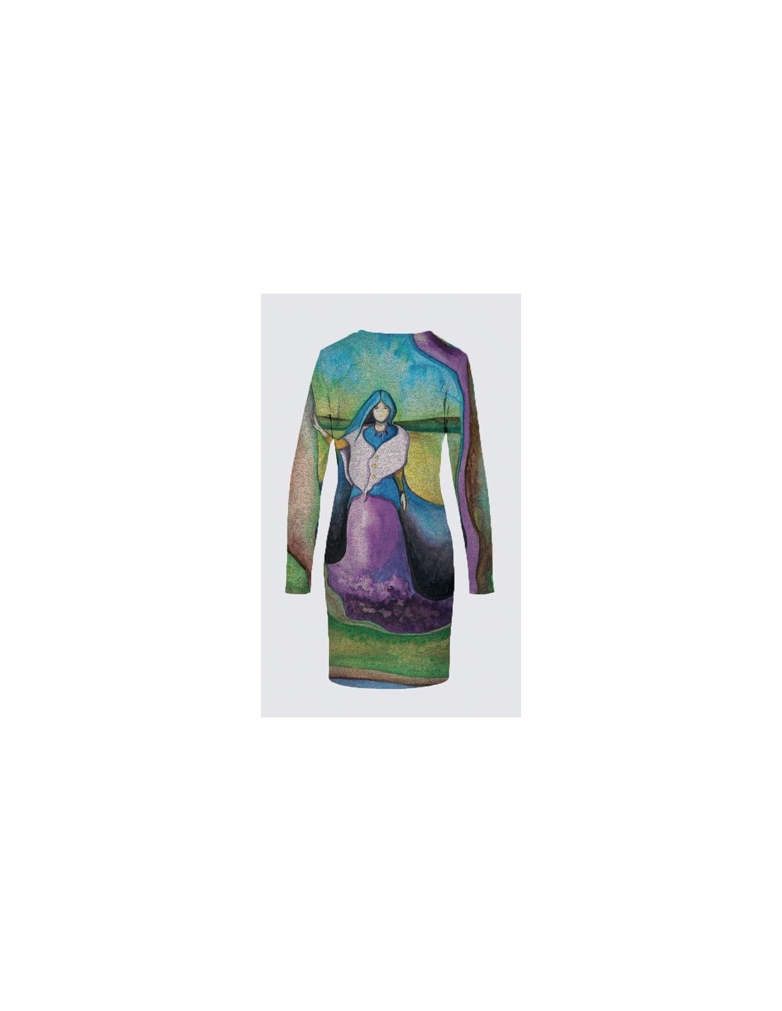 "Gardienne de la Terre" par l'artiste Nathalie Coutou. Tissu tricot super doux avec base gris chiné (95% Polyester, 5% Élasthanne). Coupe droite d'une longueur de 38" avec encolure ronde et manches pleine longueur.