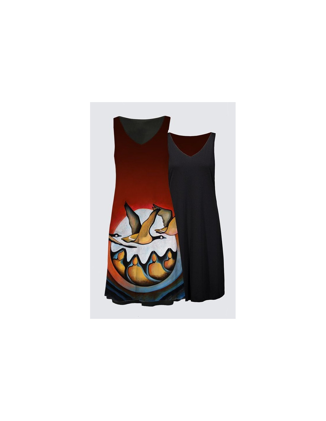 "L'Esprit de l'Outarde" par Nathalie Coutou. Robe réversible. Peut être portée de 4 façons. 96% Polyester, 4% Élasthanne. Lavez à la machine au cycle délicat à l'eau froide. Séchez à plat.