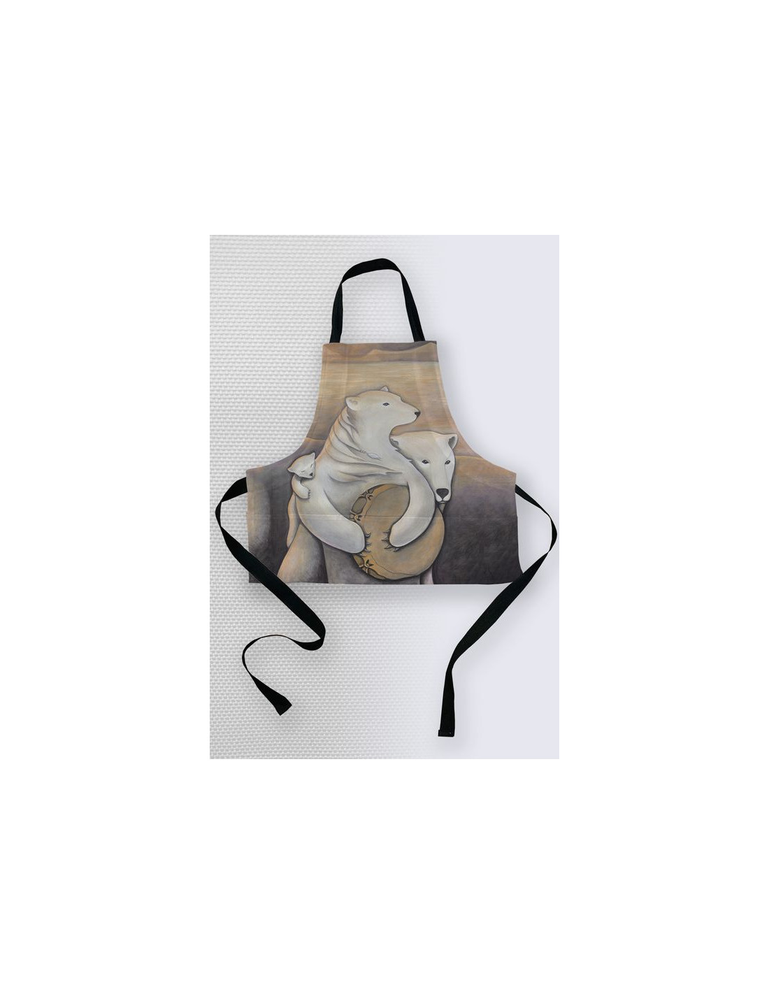 "Gardien du Nord" par l'artiste Nathalie Coutou. Tablier de taille unique pour enfant en toile texturée de 100% polyester avec sangle ajustable de 100% coton noir et trois poches à l'avant. Le tablier mesure 17" de long par 18" de large. Lavable en machine au cycle délicat, séchez à plat.