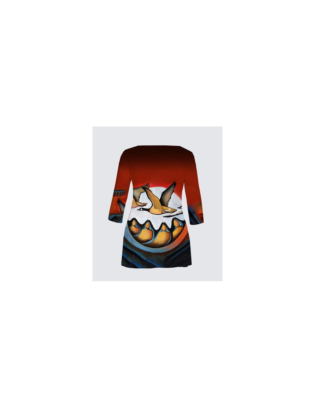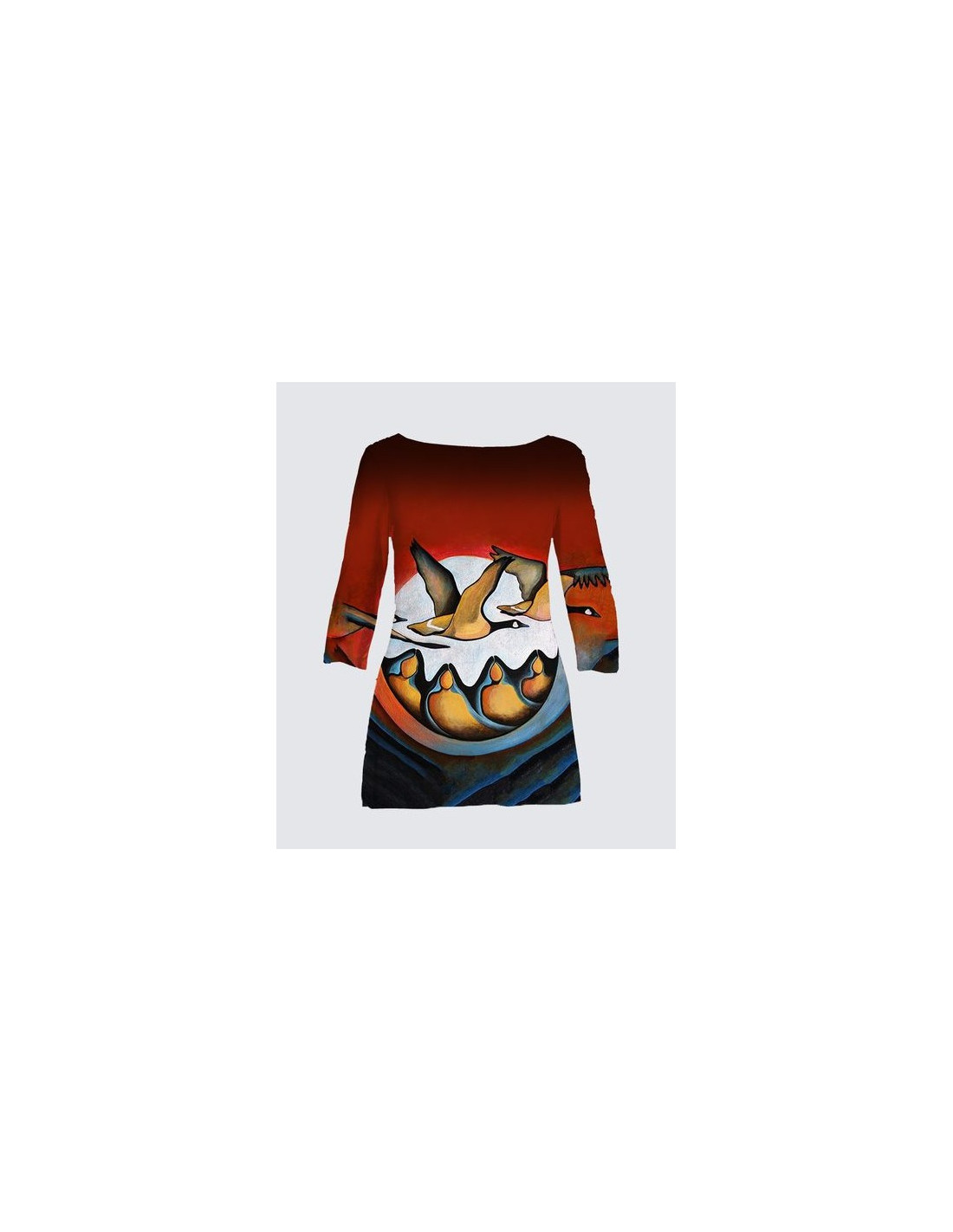 "L'Esprit de l'Outarde" de l'artiste Nathalie Coutou. Longueur 30" avec manches 3/4, encolure ronde et fentes sur les côtés . Tissu en ITY de qualité supérieure (95% Polyester, 5% Élasthanne).